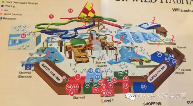 一个窍门就是入住当日早点来,1点钟就可以check-in,就可以去waterpark玩,房间最晚4点会准备好,玩了以后再去房间也不迟。第二天11点check-out,当时可以玩一整天的water park。所以就是住一晚玩两天,住两晚玩三天,以此类推。还有下午1-4点之间check-in的line非常长,早来早玩,记住记住。上面地图里面蓝色的28号可以洗澡,虽然条件差点还能凑合用,所以没有房间也不用担心,回家之前可以简单冲一下,建议带自己的洗澡洗头的用品。提醒一下带小娃的记得带安全的Q-tip,出来的时候把耳朵里面的水弄干净。
