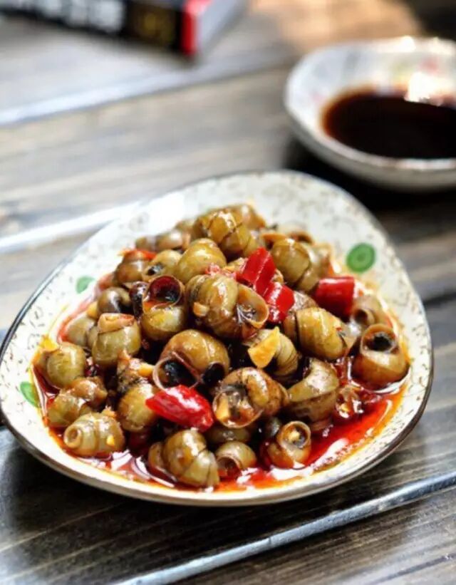 【2.辣炒田螺】 ▼ 食材:田螺、干辣椒、花椒、豆瓣、泡姜、蒜、泡椒、植物油、料酒、味精、盐、白糖。 做法: 1.田螺买回后,放清水里养3天,每天换一次水。用剪刀剪去屁股,洗净后,捞出,滤水。 2.锅内倒入适量油,放入花椒,炸出香味,捞出丢掉。 3.炒锅下油烧至八成熟,倒入田螺。 4.再下姜、蒜、泡椒、豆瓣一起炒香。 5.加入适量盐和少许砂糖炒匀。 6.加香菜、干辣椒,料酒炒出香味。 7.加入适量水,淹到田螺,中火烧至水分将干,亮油,加入少许味精拌匀,即可起锅。