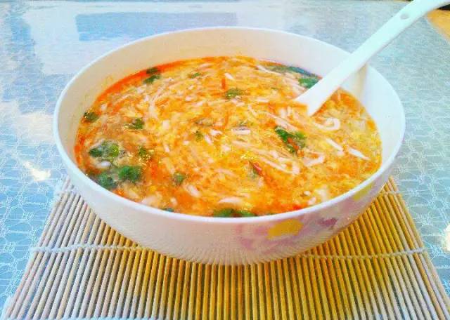 汤碗中加入适量胡椒粉,香醋,麻油把酸辣汤盛入汤碗中,加少许红油,用汤勺均匀搅拌一下即可。