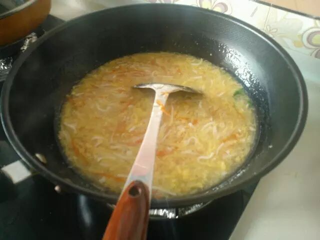 锅中加大半汤碗开水,烧沸腾,放少许盐,鸡精,几滴酱油。先把开水用淀粉勾芡,大火先把豆腐丝放入,搅拌均匀。接着鸡蛋液慢慢倒入,用筷子搅拌均匀,再把胡萝卜丝,金针菇放入,羹烧开。加入香菜。
