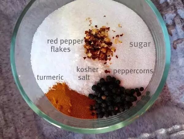 1、制作腌制的盐水。为了让蔬菜的口感更丰富一点,可以再添加一些香料和洋葱,将孜然、盐、醋、洋葱、胡椒粉、辣椒末加水混合后加热