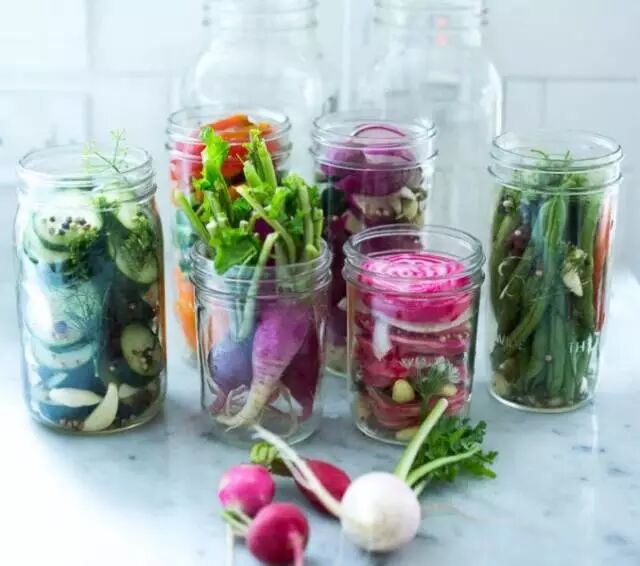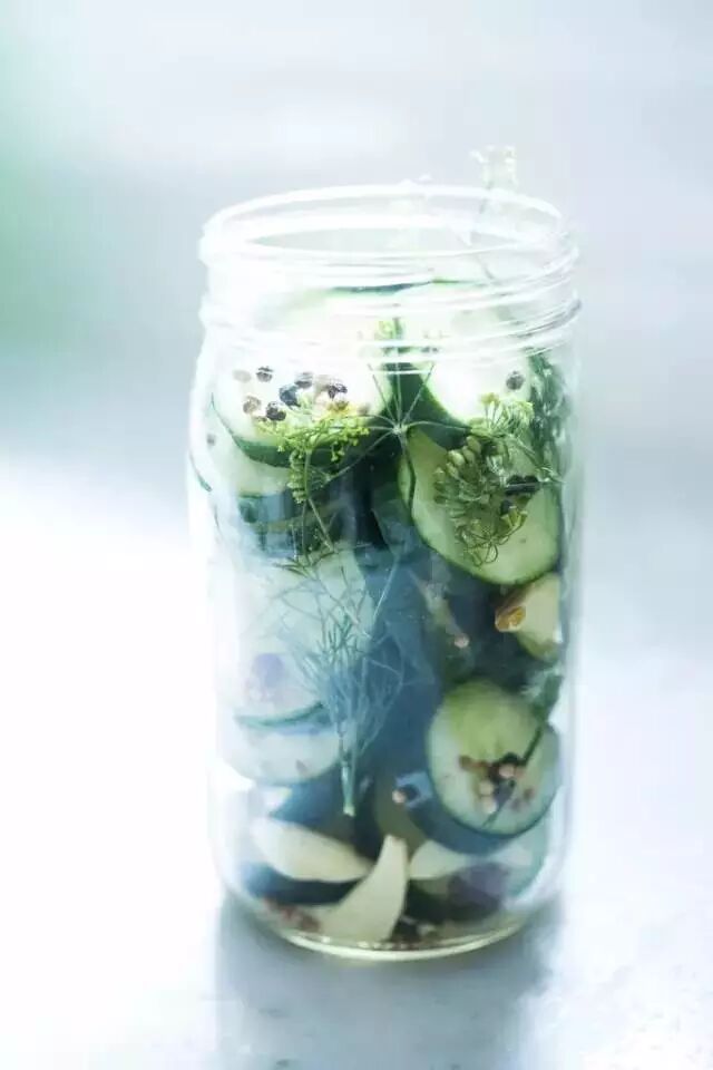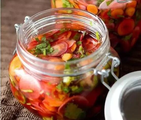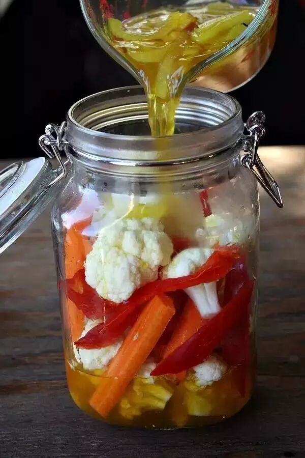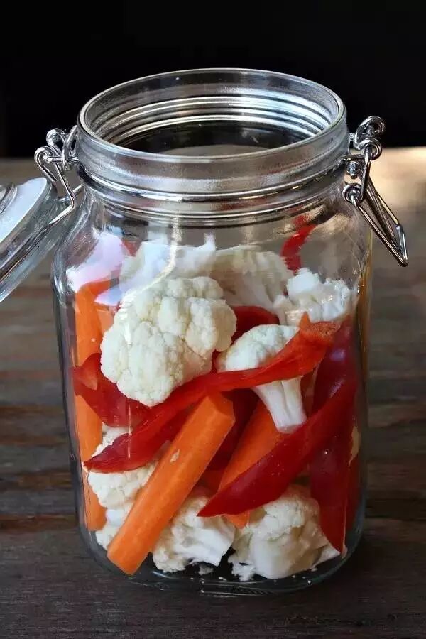 3、将煮好的热的盐水倒入瓶子中,水要高过蔬菜顶部,密封瓶子,晾凉。放到冰箱里口感更好~腌制时间大约是2-3天