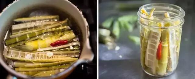 2、腌制。将切好的笋和辣椒、蒜头、盐、米醋一起放入锅中,煮上10到15分钟,让竹笋充分入味。喜欢吃辣的还可以加点花椒~
