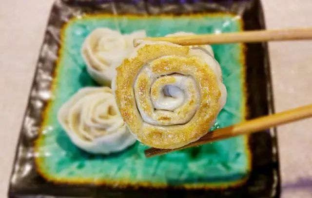 煎起来的玫瑰饺子,底部黄黄的,脆脆的,超级像锅贴,打个鸡蛋在底部煎起来也是很不错的!