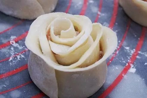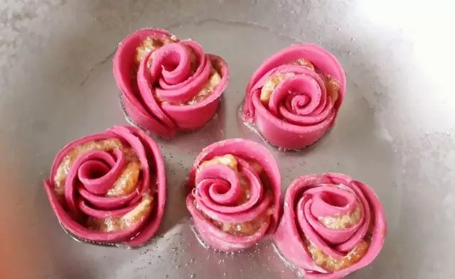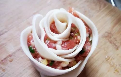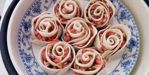 美食君小贴士:包饺子花的关键是第2步中的肉千万不能多,不然会会卷不起来。卷完之后可以把面皮边捏弯一点,就更像玫瑰了。这饺子,蒸着吃不错,用平底锅煎着吃更好吃。