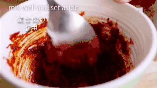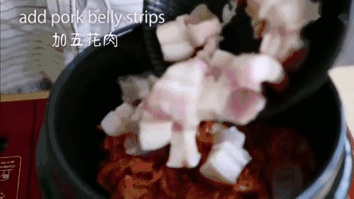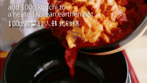 3. 碗中加辣椒粉、生抽、香油、辣椒酱,酱料搅拌均匀。 4. 砂锅中加泡菜、五花肉、洋葱、白胡椒粉、糖、酱料、凤尾鱼汤(不用倒满砂锅,80%即可),拌匀,盖上锅盖,煮8分钟。